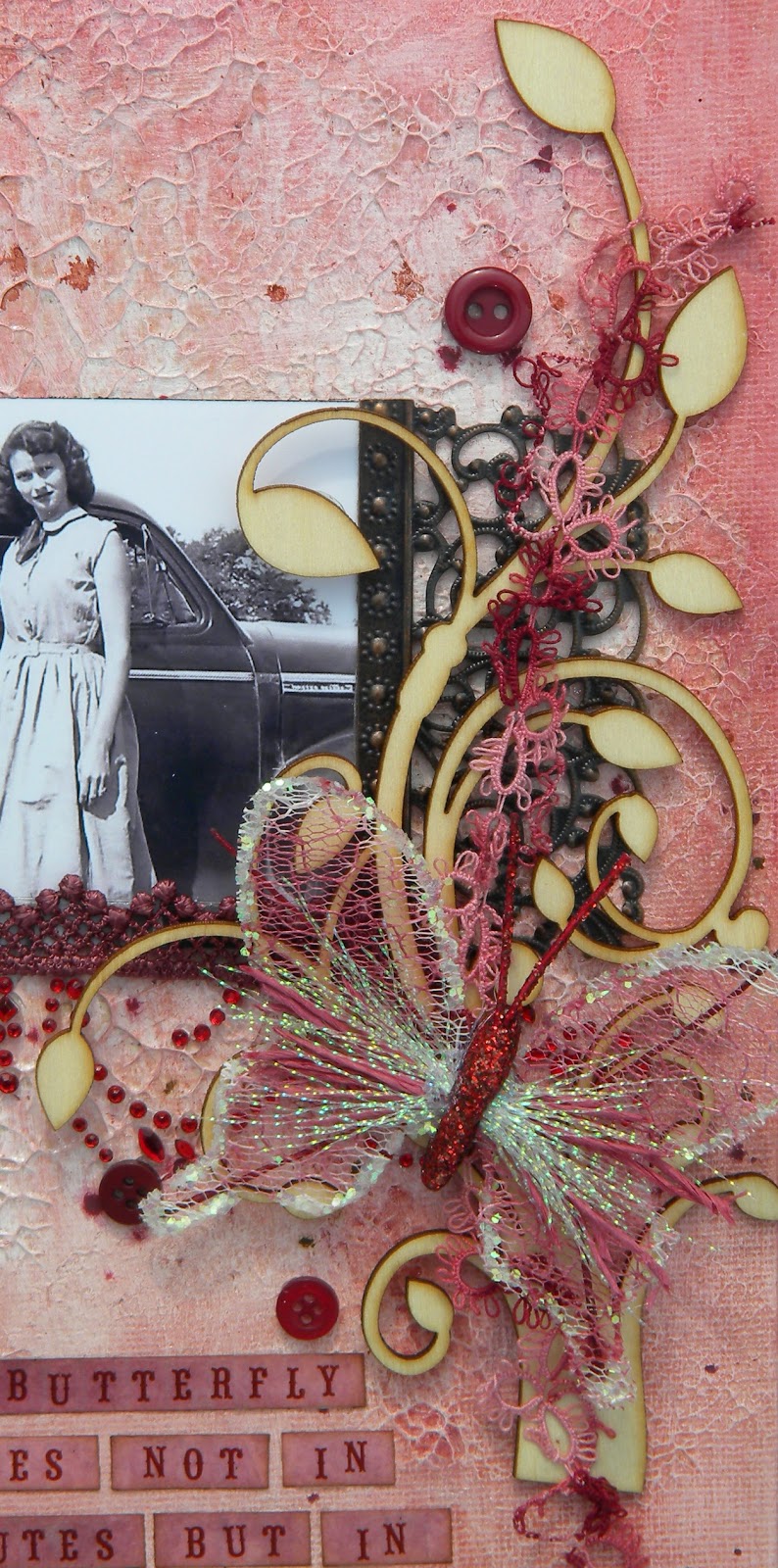 Ingredients: Molding Paste, Gesso, Rubber Stampede Crackled Background stamp, Tattered Angels Baseboard and Glimmer Mist, Prima butterfly and ribbon with rhinestones, Kaisercraft wood element, buttons, antique ribbon, Glue Dots permanent, Cosmo Cricket tiny letters, I used a flat canvas because that is what I had for a harder background, but you can use a chipboard type background (Graphix, Sizzix, and more make a 12 x 12).